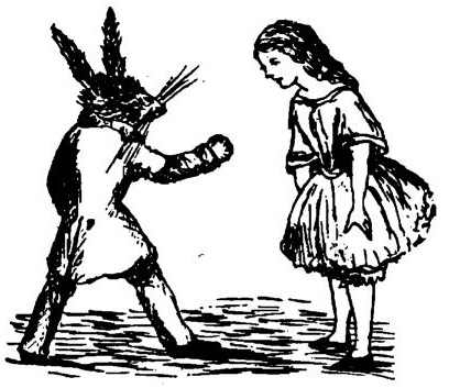 Вскоре Кролик заметил хлопочущую Аню и сердито ей крикнул: «Маша, что ты тут делаешь? Сию же минуту сбегай домой и принеси мне пару белых перчаток и веер! Живо!» И Аня так перепугалась, что тотчас же, не пытаясь объяснить ошибку, метнулась по направлению, в которое Кролик указал дрожащей от гнева лапкой.