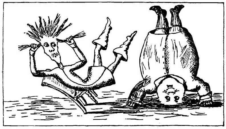 – Какой же из них заставит меня вырасти? – сказала она про себя и погрызла кусочек в правой руке, чтобы узнать последствие. Тотчас же она почувствовала сильный удар в подбородок и в ногу – они столкнулись!