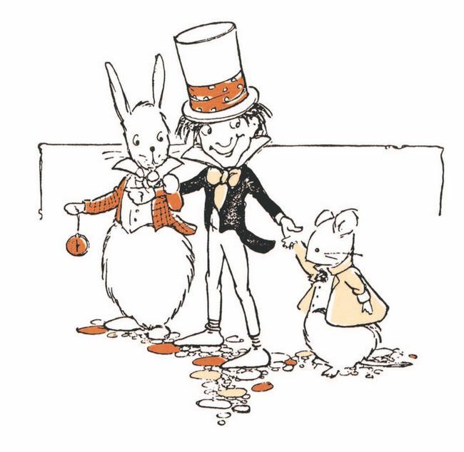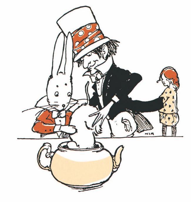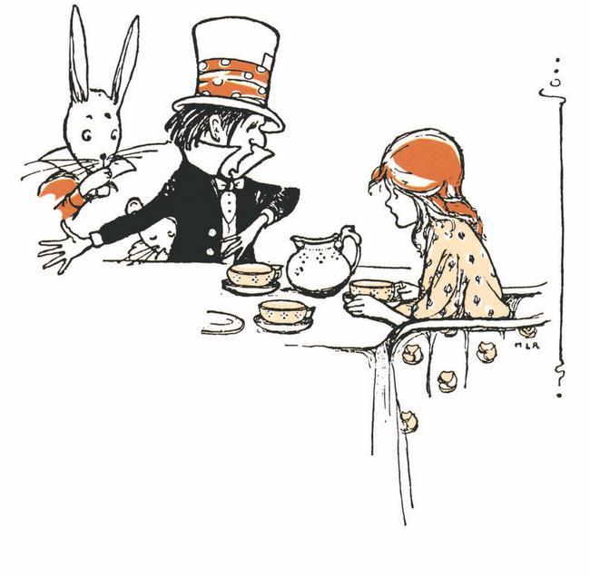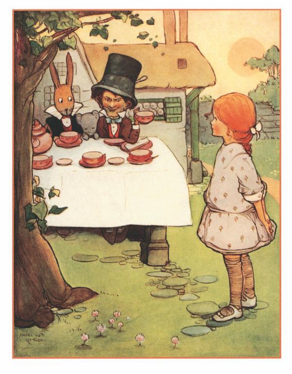 Перед домом под деревом Мартовский Заяц и Шляпник сидели за столом и пили чай. Сурок, пристроившись между ними, похоже, заснул, и его приятели, облокотившись на него, как ни в чём не бывало вели беседу.