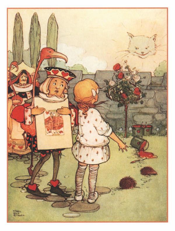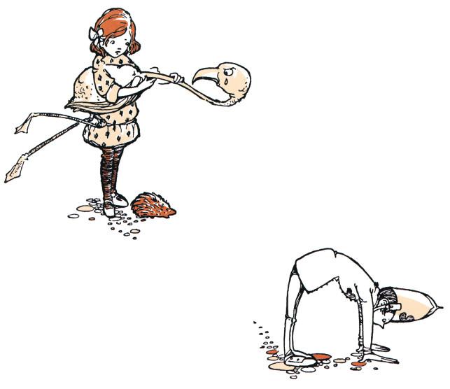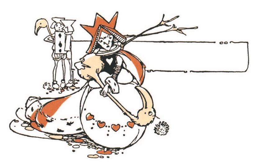 – Здесь все играют неправильно, – пожаловалась Алиса, – и так ссорятся и кричат, что не услышишь собственного голоса. Никаких правил у них нет. И вы не можете себе представить, как неудобно играть живыми птицами и ежами. Несколько минут назад мой ёж прошёл в ворота, и мне, наверное, удалось бы крокировать ежа Королевы, но тот, увидев, что мой ёж катится к нему, преспокойно убежал!