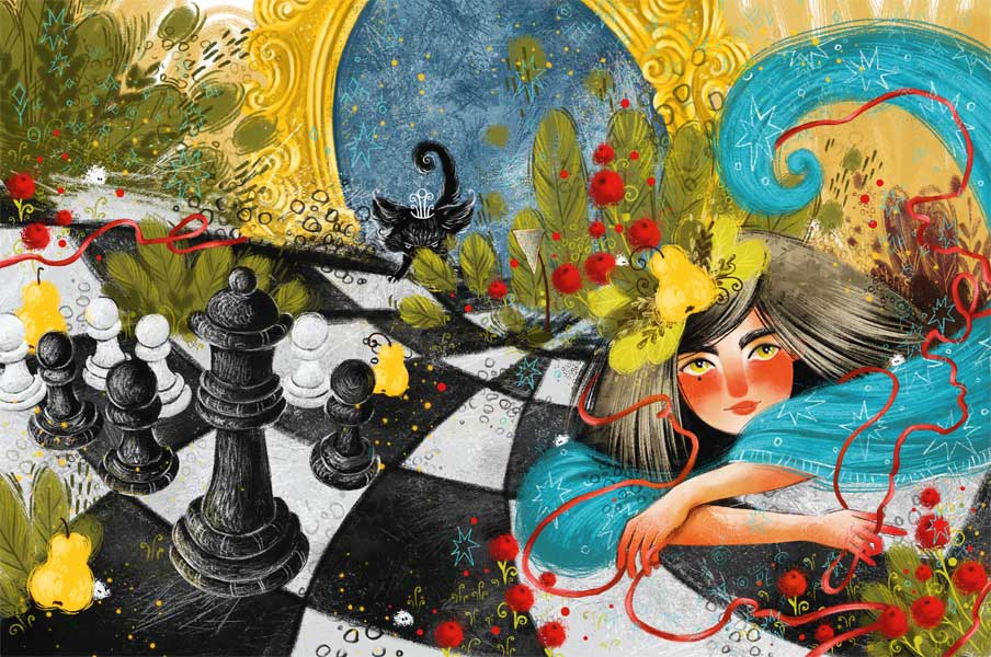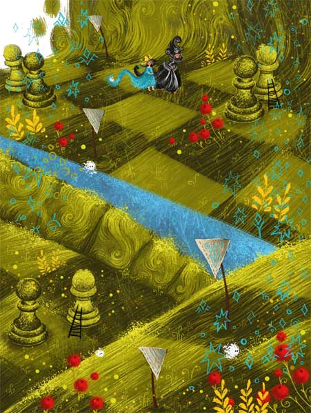 – По-моему, Зазеркалье страшно похоже на шахматную доску, – сказала наконец Алиса. – Только фигур почему-то не видно… А впрочем, вот и они! – радостно закричала она, и сердце громко забилось у нее в груди.