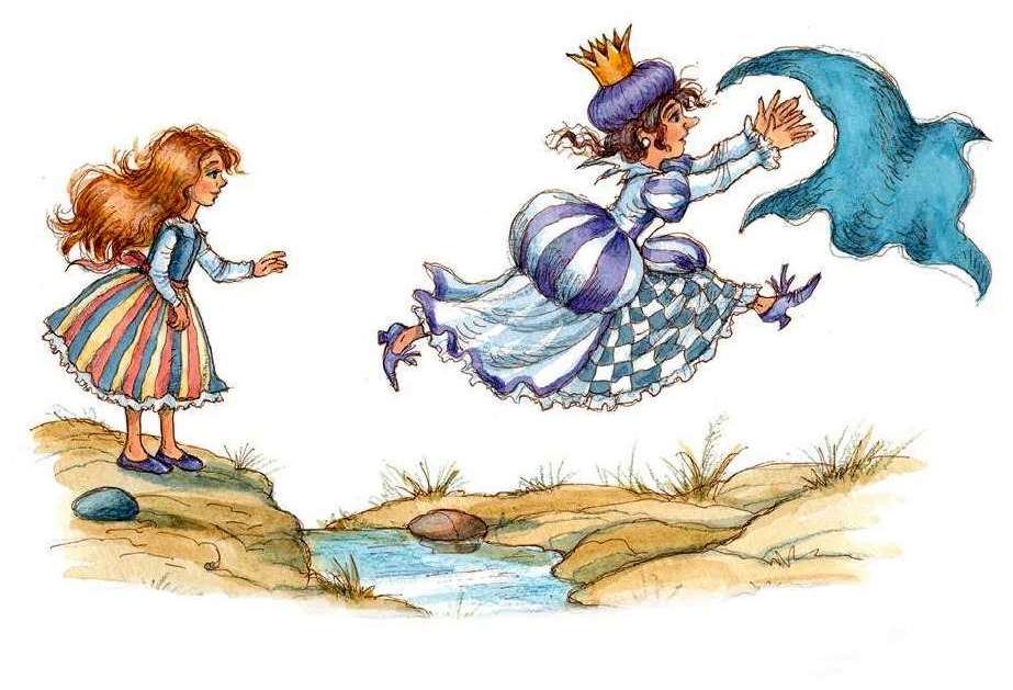 Алиса поймала шаль на лету, а через минуту показалась и её хозяйка, Белая Королева, которая неслась как безумная, с широко распахнутыми объятиями, так что была похожа на огромную летящую птицу. Девочка почтительно пошла Королеве навстречу, вытянув руки с шалью перед собой.