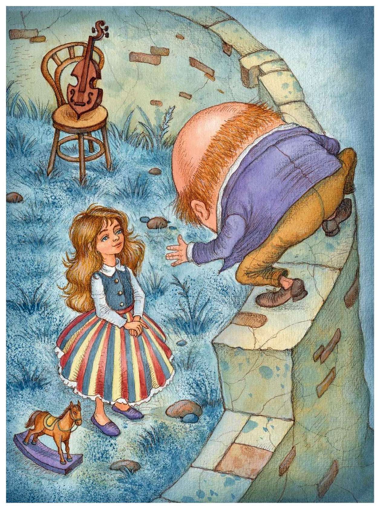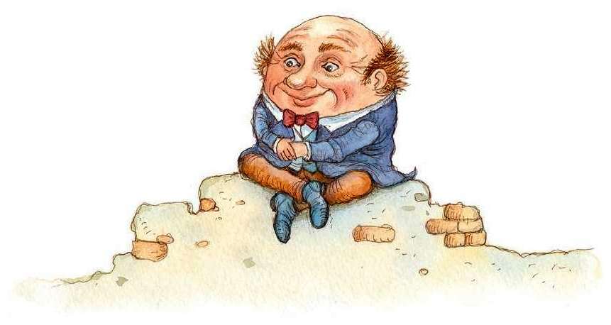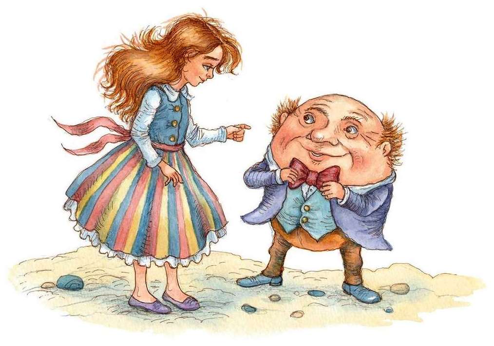 …Однако яйцо всё продолжало расти, увеличиваться в объёме и, наконец, приобретать очертания человеческой фигуры. Алиса сделала ещё несколько шагов и смогла разглядеть, что у яйца имеются глаза, рот и нос, а когда подошла ещё ближе, то ясно увидела, что перед ней не кто иной, как Болванчик собственной персоной.