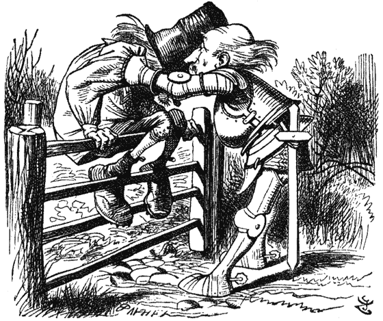 В волнении Рыцарь воздел руки к небу – и тотчас вылетел из седла и шлепнулся головой в канаву. Алиса бросилась к нему. Падение было неожиданным – на этот раз ему удалось довольно долго продержаться в седле, и Алиса боялась, не ушибся ли он. Из канавы торчали одни лишь ноги, но, услышав, что он продолжает как ни в чем не бывало говорить, она успокоилась.