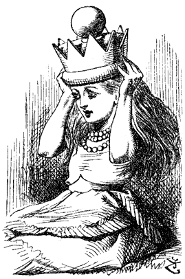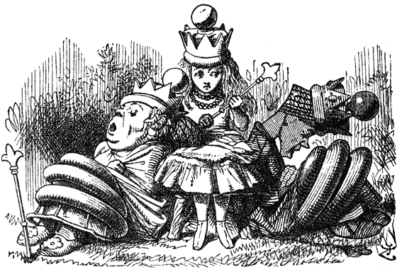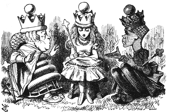 Во главе стола стояли три кресла; в одном сидела Белая Королева, в другом – Черная, а кресло между ними было свободно. Алиса уселась в него, смущенная всеобщим молчанием; ей так хотелось, чтобы кто-нибудь заговорил.