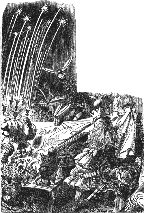 И тут (как говорила потом Алиса) началось что-то несусветное. Свечи вдруг вытянулись до потолка, словно гигантские камыши с фейерверком наверху. Бутылки схватили по паре тарелок и вилок – хлопая тарелками, словно крыльями, и перебирая вилками-ногами, они разлетелись в разные стороны.