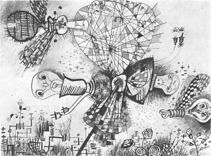 – Вот именно, – ответил Комар. – Если вы внимательно посмотрите во-о-он на тот цветок, то заметите, что над ним вьется ПЧЕЛАМПА, а неподалеку от нее летает ТОРШЕРШЕНЬ. Они сделаны из стекла, и у обоих есть красивые железные подставки.