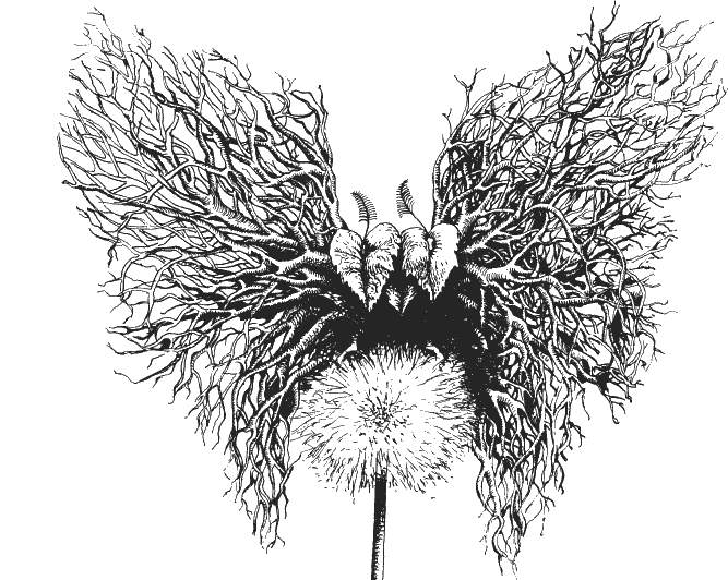 – Взгляните себе под ноги, – заметил Комар (Алиса испуганно отскочила в сторону), – и вы увидите, что на одуванчике сидит БАОБАБОЧКА. Крылья у нее сделаны из веток, а голова – из зеленых листьев БАОБАБА.