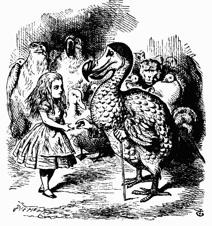 'What is a Caucus-race?' said Alice; not that she wanted much to know, but the Dodo had paused as if it thought that somebody ought to speak, and no one else seemed inclined to say anything.