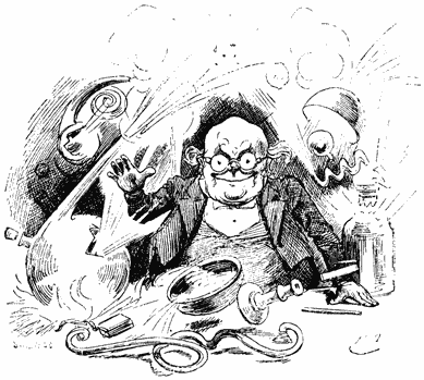 – Увы, никак не могу вспомнить его название, – отвечал Профессор, – а ярлычок куда-то потерялся. – Он быстро перелил содержимое пузырька в какой-то другой пузырек, и в тот же миг оба пузырька с грохотом разлетелись вдребезги, опрокинув машинки на столике и наполнив Беседку густым черным дымом. Я испуганно вскочил на ноги – и обнаружил, что по-прежнему одиноко сижу перед камином, а кочерга, странным образом соскользнувшая с крючка, ударила по щипцам и совку и опрокинула чайник, наполнивший камин клубами пара. Я грустно вздохнул и отправился спать.