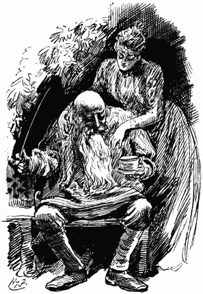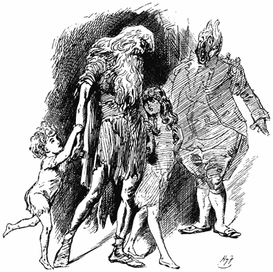 Лорд-Канцлер опрометью бросился в дальний конец зала, и спустя минуту толпа расступилась, и в Банкетный Зал вошел старик Нищий. Он и впрямь выглядел довольно странно: лохмотья, едва прикрывавшие его тело, были покрыты дорожной грязью, а седые волосы и длинная борода пребывали в диком беспорядке и торчали клочьями. Тем не менее он шел выпрямившись и подняв голову, как человек, привыкший повелевать, и, что самое странное, рядом с ним шагали Сильвия и Бруно. Они держали его за руки и не сводили с него глаз, полных самой нежной любви.
