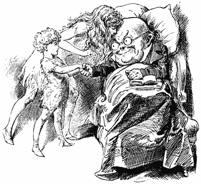 Но, войдя в комнату, я понял, что оказался не в обычном свете лампы, а в каком-то волшебном, завораживающем сиянии. О, это был куда более яркий, золотистый и густой свет, чем мерцание лампы! Он струился в комнату из окна, которого я прежде не замечал, выделяя группу из трех неясных фигур. Они с каждым мгновением становились все более и более четкими, и я узнал пожилого мужчину в королевской мантии, откинувшегося назад на спинке стула, и двух детей – мальчика и девочку, – стоявших по обеим сторонам от него.