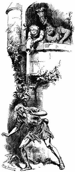 Горячей кочерги, видимо, под рукой не оказалось, но палки градом полетели в нищего. Старого бродягу со всех сторон окружили злобные лица слуг, так что ему пришлось попятиться.