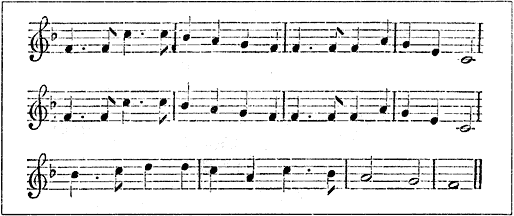 Я отвечал, что вижу поблизости только один стебелек колокольчиков, и, дотянувшись до него, пригнул цветок к земле. Бруно раз-другой тронул ладошками цветки, словно музыкант, настраивающий струны. В ответ послышался нежный мелодичный звон. Мне еще не приходилось слышать цветочную музыку, да это и вряд ли возможно, разве что в таком же «феерическом» состоянии, и поэтому я затрудняюсь сказать, на что она больше похожа. Может быть, она чем-то напоминает звон серебряных колокольчиков, доносящийся откуда-то за тысячи миль. Когда же малыш посчитал, что цветки настроены, он опять уселся на дохлую мышку (ни на чем другом ему не было столь же удобно, как на ней) и, взглянув на меня своими сверкающими глазками, заиграл. Кстати сказать, мелодия была довольно любопытной. Вы можете сами убедиться в этом. Вот ее ноты.
