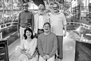 Слева направо члены первого клуба смеха в 1995 г.: (стоят) Мадан Мохан Пушкарна, Мохан Сингх, Раджендра Тандон; (сидят) Мадхури и д-р Мадан Катария