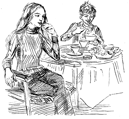 Эммелина рассеянно обводила взглядом присутствующих. Глаза у нее были голубые-голубые, что называется «лазурные очи». Пряди белокурых волос мешали ей откусить бутерброд, и, когда она убирала их рукой, между волосами и бутербродом оказывалось точеное, нежно-розовое, с тонким и прямым носиком личико. Голубой свитер оставлял открытой длинную гибкую шею.