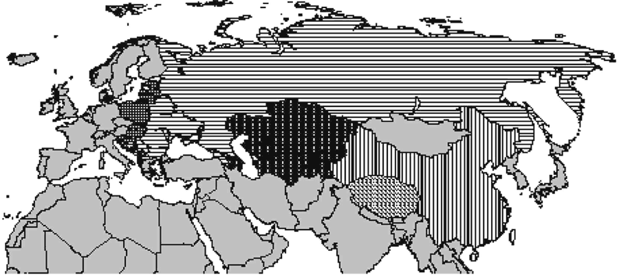 Условные обозначения: заштрихована клеткой: западно-христианская; горизонтальные линии: православная; вертикальные пунктирные линии: исламская; вертикальные линии: синская; диагональные слева направо: буддистская; серый цвет – за пределами рассматриваемого нами посткоммунистического региона. На основе: Хантингтон С. Столкновение цивилизаций.