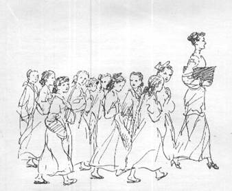 Желтоволосая классная дама выстраивает девочек парами и ставит Галю рядом с той самой синеглазой соседкой, которая смотрела на неё в спальне. Девочка продолжает свои наблюдения, и Гале делается неловко. Она старается смотреть в сторону, но здесь взгляд её встречается с холодными глазами классной дамы, и, окончательно растерявшись, она низко опускает голову и начинает внимательно рассматривать пол.