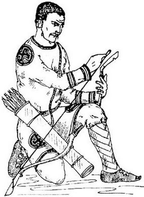 Когда лук не использовали, с него снимали тетиву, чтобы он сохранял свой естественный изгиб. Чтобы вновь натянуть тетиву, лучник использовал известный по многочисленным скифским изображениям прием: сгибал лук, держа его под ногой[460]460