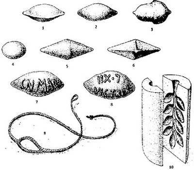 Рис. 47. 1–6 – наиболее распространенная форма пуль для пращей; 7 – свинцовая пуля, обнаруженная в Испании; датируется временем войны Помпея против Сертория; надпись: CN(eus Pompeus) MAC(nus); 8 – свинцовая пуля, обнаруженная в Перудже; 9 – праща из пеньки; такие пращи еще и сегодня делают на Балеарских островах; 10 – Реконструкция формы для отлива свинцовых пуль для пращей.
