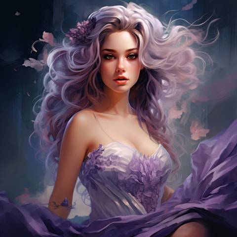Одета она была в красивое длинное фиолетовое платье, расшитое узорами. В руках девушка держала посох с загнутым полукруглым навершием в виде головы дракона. Её длинные волосы русого цвета колыхались на ветру. Глаза были бездонно-голубыми, а лицо очень красивым.