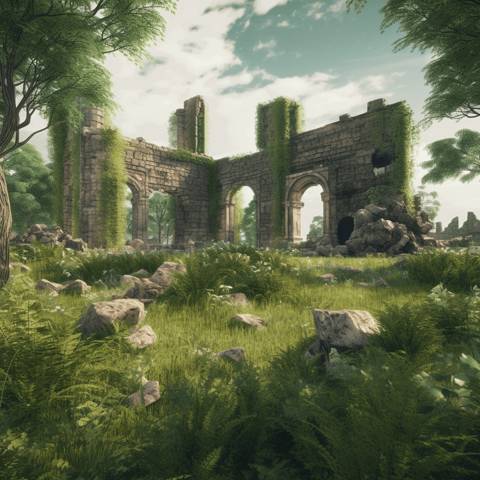 Вокруг дорожки на зелёных лугах располагались не только деревья, но и различные развалины в виде античных колонн и статуй. Справа, метрах в пятидесяти от меня, лежали руины какого-то древнего сооружения.