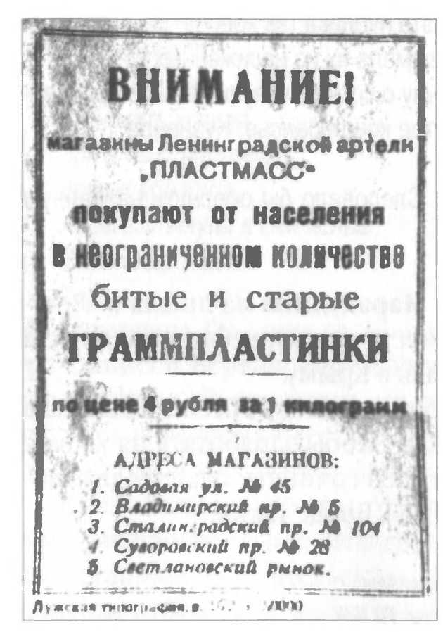 Запасы дореволюционных пластинок на складах массово уничтожались, а чтобы изъять те, что оставались на руках у населения, государство производило централизованную скупку или ставило условие: продажа новых записей только в обмен на «бой» старых дисков