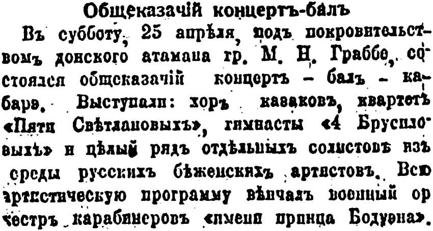 Н. В. Плевицкая, жившая в Берлине и концертировавшая в Германии и Австрии, в конце декабря уезжает на ряд концертов в Сербию и Болгарию, а оттуда в Америку (Нью-Йорк, Чикаго, Филадельфию) и Канаду.