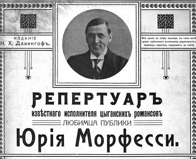А об успехах на любовном фронте Юрия Морфесси написал конферансье А. Г. Алексеев в своих мемуарах «Серьезное и смешное»: «Грек, по происхождению, черноволосый и черноглазый красавец, Морфесси прекрасно знал свои достоинства и держал себя на сцене “кумиром”. Да и в жизни он “играл” эту роль: входил ли он в парикмахерскую, подзывал ли извозчика, давал ли в ресторане швейцару на чай – каждый жест его был величавым жестом аристократа… из провинциальной оперетты. И дамы критического возраста млели, а гимназистки и старые девы визжали у рампы».