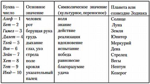 Вот каковы значения для первых десяти букв древнееврейского алфавита: