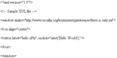 Знакомым с JavaScript-сценариями в HTML или XML этот пример должен быть кристально понятным. Однако внимание следует обратить на то, что элементы разметки, определяемые XUL, свойственны графическим интерфейсам общего назначения («окно» (window), «контейнер» (box), «кнопка» (button) и т.п.), и весь XUL-файл определяет интерфейс, а не страницу67 67 Строго говоря, «Мозилла» поддерживает и смешанные контексты, например, XUL-компоненты в HTML или наоборот, но XUL-интерпретатор как таковой не обязан этого делать, и XUL-интерпретатором, соответственно, вовсе не обязательно должен быть браузер.
