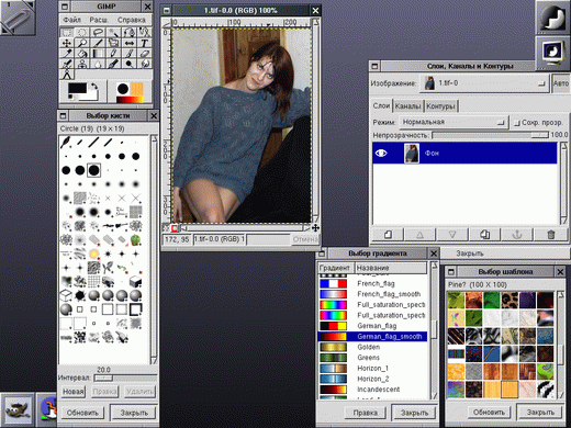 При запуске «ГИМП» на экране открывается ряд окон (Рис. 5-1). Главное окно содержит меню основных функций, панель пиктографически обозначенных «инструментов» и области, в которых отображаются текущие значения основного и фонового цветов, формы кисти, текущего градиента. Окна изображения соответствуют отдельным открытым графическим файлам (или слоям в них).