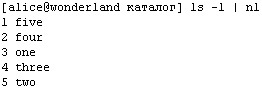 В следующем примере Алисе по каким-то причинам нужно получить пронумерованный список файлов в одном из каталогов. У команды «ls» нет соответствующего ключа, хотя есть ключ «-1» (единица), позволяющий осуществить вывод списка в «коротком» формате по одному файлу на строку. Но в системе имеется стандартная команда «nl», выводящая строки ввода, предваренные их номерами.