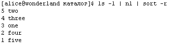 В конвейер могут быть связаны и более двух команд. В примере на Рис. 1-69 Алиса передает, как и ранее, вывод команды «ls» команде «nl», а вывод «nl» передает команде «sort -r», которая (с этим ключом) выводит свой ввод, отсортированный в обратном порядке.