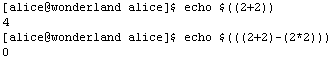 Выражения обычно вводятся в программу с использованием конструкции арифметического раскрытия выражений «$((выражение))». Заключенная в двойные круглые цепочка символов интерпретируется как арифметическое или логическое выражение, результат вычисления которого оболочкой подставляется на место вхождения этой конструкции в командной строке (Рис. 1-72).