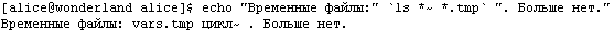В примере на Рис. 1-91 команда «echo» подается с тремя операндами, первый и последний из которых являются текстовыми константами, а второй – результатом раскрытия команды «ls *~ *.tmp», то есть списком файлов, соответствующих первому и второму шаблонам, указанным в качестве операндов команды «ls».