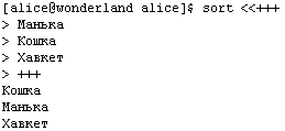 На Рис. представлена конструкция вида «<<цепочка», внешне похожая на перенаправление ввода команды из файла. Однако цепочка представляет собой не имя файла, а ограничивающую цепочку символов, а сам ввод осуществляется непосредственно из файла сценария (или, в данном случае, с терминала) до тех пор, пока очередная строка не совпадет с ограничивающей цепочкой (Рис. 1-92).
