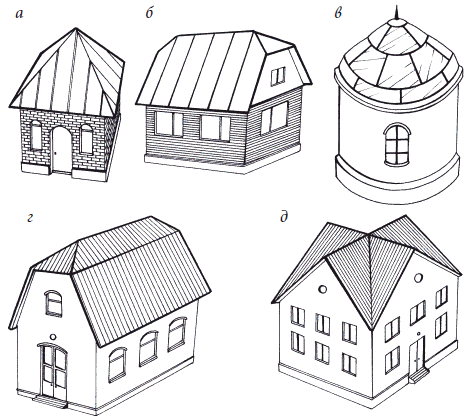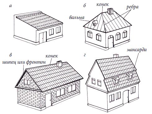 Скатные крыши бывают самой разной формы: односкатные, двускатные и четырехскатные, вальмовые, мансардные (рис. 10).