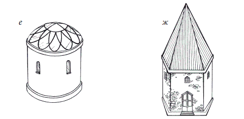 Рисунок 9.Формы крыш: а) шатровая; б) полувальмовая; в) конусная; г) мансардная крыша с полувальмой; д) четырехщипцовая; е) купольная; ж) пирамидальная