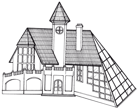 Как видно из рисунка, конструкция дома подразумевает хаотичное распределение этажей по высоте и относительно друг друга. Кроме башни, можно увидеть на рисунке еще интересный элемент: плавный спуск боковой части двускатной крыши до уровня земли. В этой части здания можно разместить прекрасный зимний сад, при условии использования особых материалов в конструкции этой части крыши. Эркер спальни с выходом на террасу венчает также пирамидальная крыша с переходом в двускатную. Эта конструктивная сложность (составная конструкция крыши) сделает дом непохожим на другие, наделит его индивидуальностью и даже неким шармом.