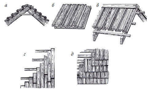 Рисунок 18.Деревянные кровли: а) тесовая внахлестку; б) тесовая двухслойная; в) общий вид тесовой кровли вразбежку; г) драночная; д) щепеная