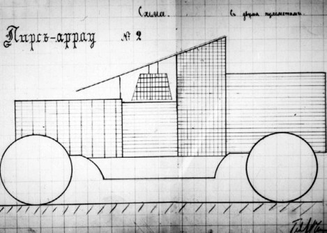 Схема бронировки гоночного „Бенца“ в 100 л.с. под установку 37-мм пушки и пулемета, представленная подполковником Чемерзиным в ГВТУ. Ноябрь 1914 года (РГВИА).