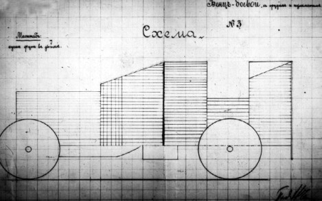 Схема бронировки гоночного „Бенца“ в 150 л.с. для ведения разведки, представленная подполковником Чемерзиным в ГВТУ. Ноябрь 1914 года (РГВИА).