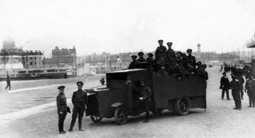 Солдаты и офицеры у броневика «Дерзкий» фирмы «Остин» 14-го автопулеметного взвода. Западный фронт, 1915 год (ЦМВС).