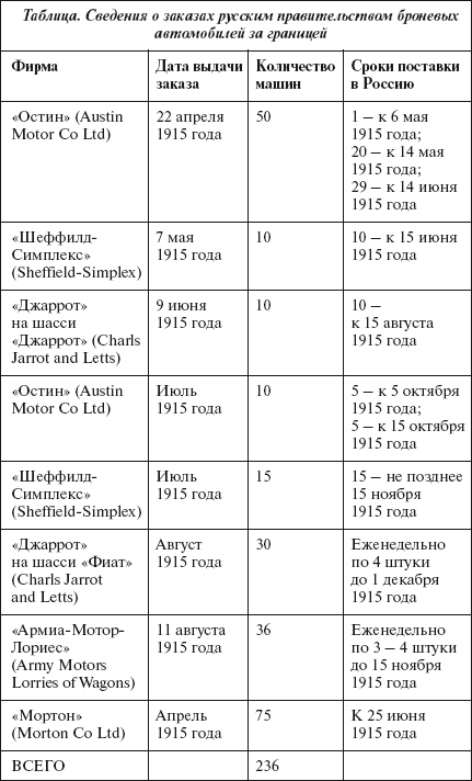 Весной 1915 года, когда заканчивалось формирование автопулеметных взводов из «остинов» 1-й серии (с 5-го по 23-й), встал вопрос о заказе дополнительного числа броневых машин для обеспечения новых броневых частей. А так как бронирование автомобилей на русских предприятиях требовало довольно большого времени и, главным образом, доставки из-за границы необходимых шасси, ГВТУ приняло решение разместить заказы за границей. В начале марта 1915 года Англо-Русскому правительственному комитету* в Лондоне поручили заключение контрактов на изготовление бронеавтомобилей по русским проектам. Количество и сроки сдачи заказов можно увидеть в приводимой таблице.