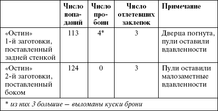 На дистанции 440 шагов была произведена стрельба из германского пулемета по четырем автомобилям „Остин“ 1 и 2-й заготовки. Результаты следующие: