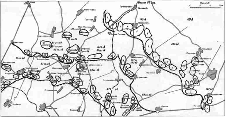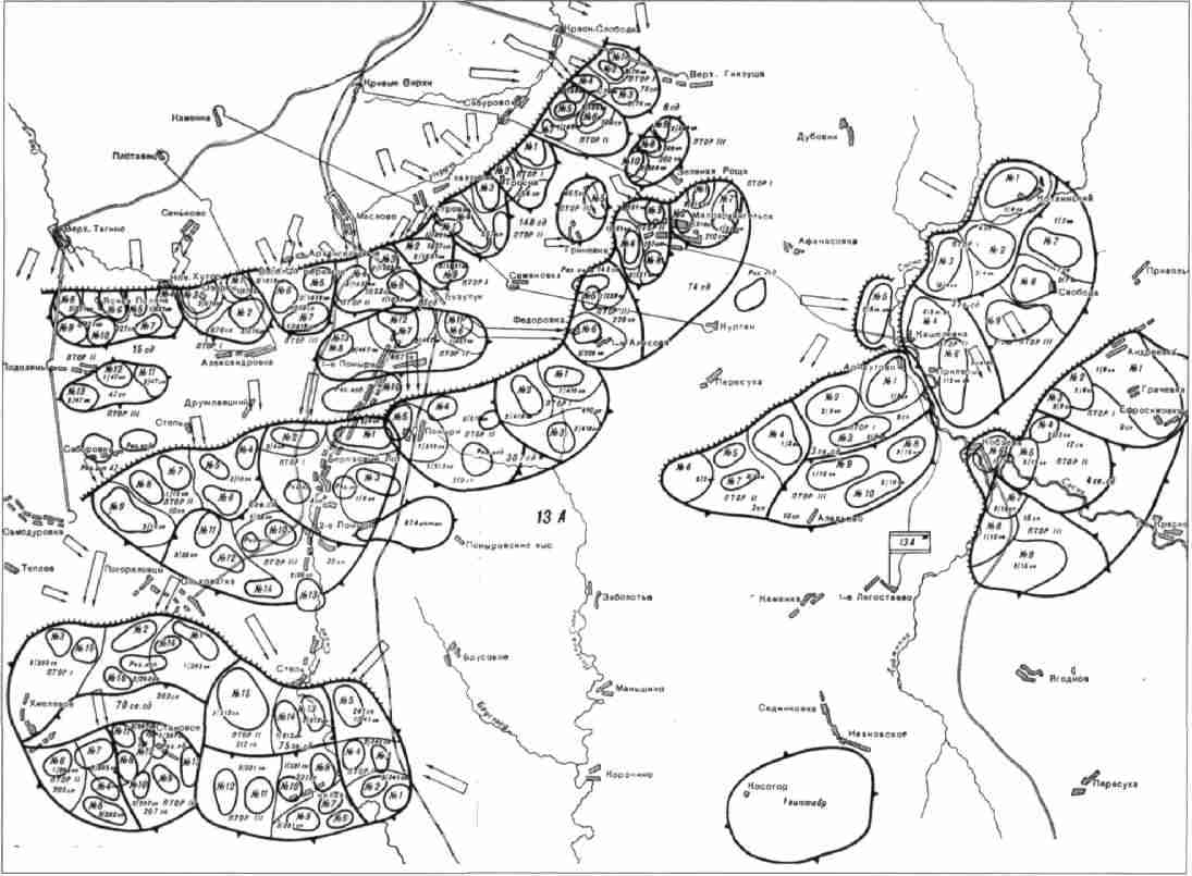 Схема расположения противотанковых районов на южном фасе Курской дуги.