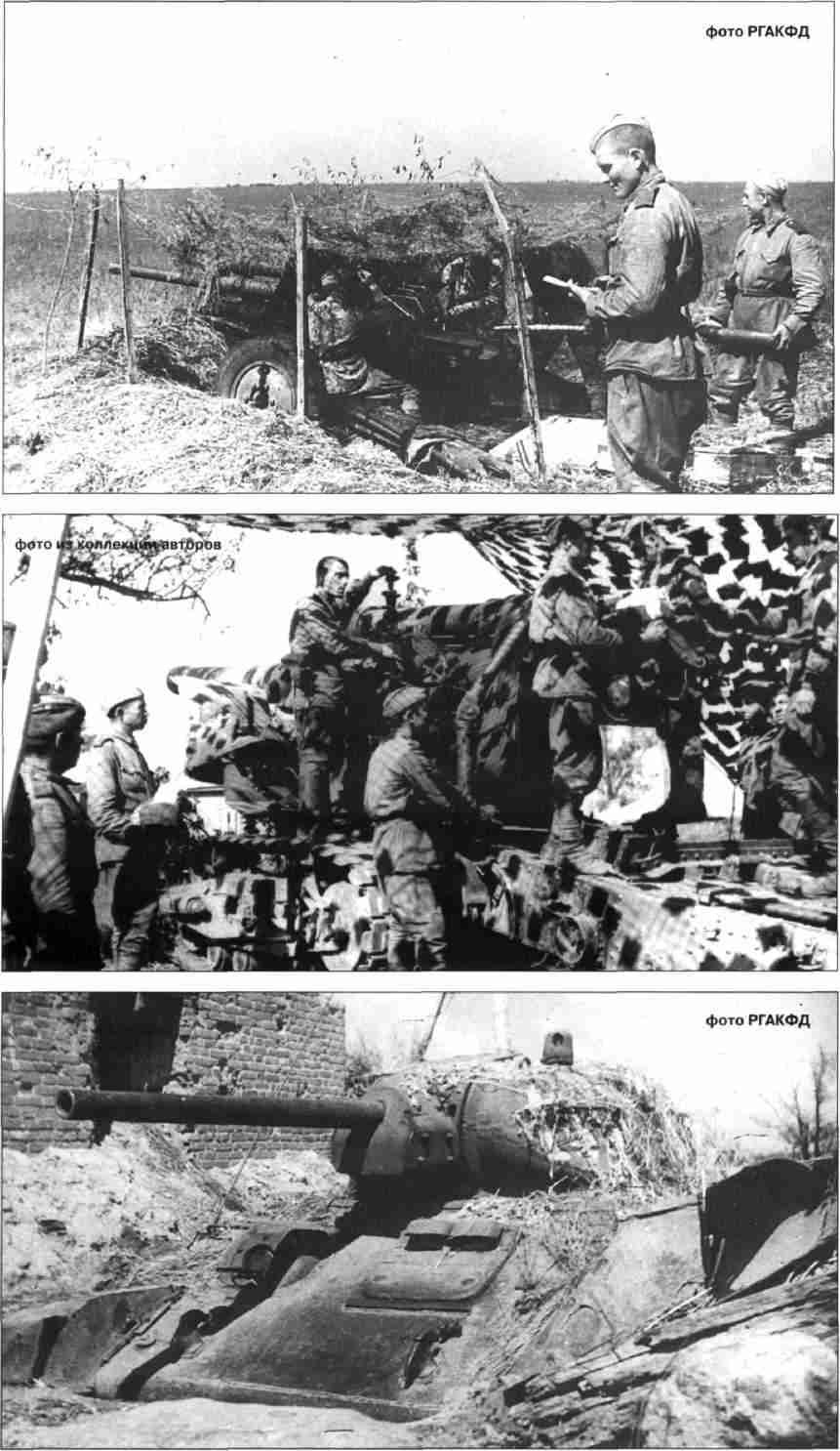 Нижний снимок – Замаскированный советский средний танк в засаде на подступах к ст. Поныри.