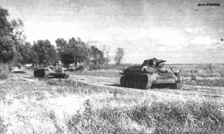 Т-70 and Т-34 of 2nd tank army move to counterattack position. July 1943.