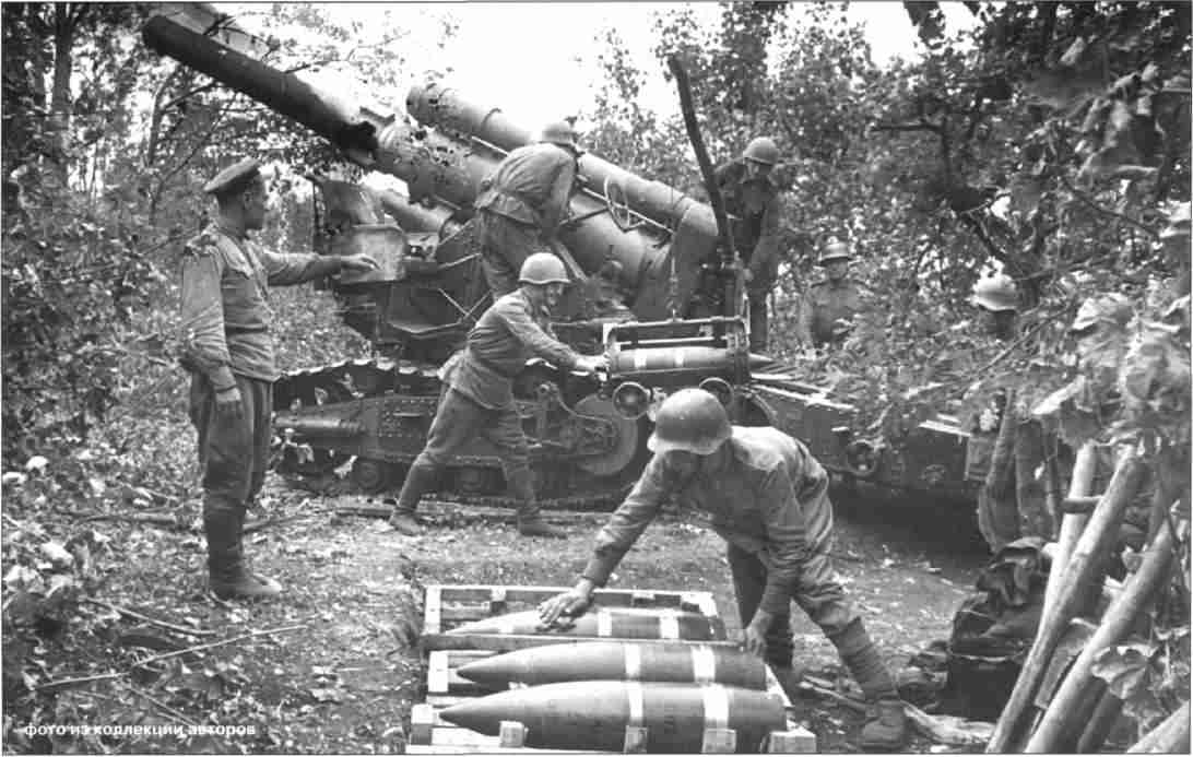 The B-4 gun of general Ignatiev artillery division fires to German troops near Ponyri station. July 1943.